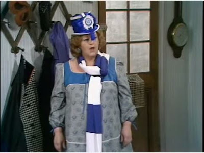 Madge from the bread shop turns up in the form of Joan Sims, and proves to be an old flame of Eric's. Having bet against Hattie, she's not happy with the idea of the match being fixed the other way ("You've got a nerve! After all the doughnuts I've slipped in your carrier bag!"). Her shop's packed out with people placing bets. In the end she puts £20 on Wood Lane and £50 on Sebastopol.